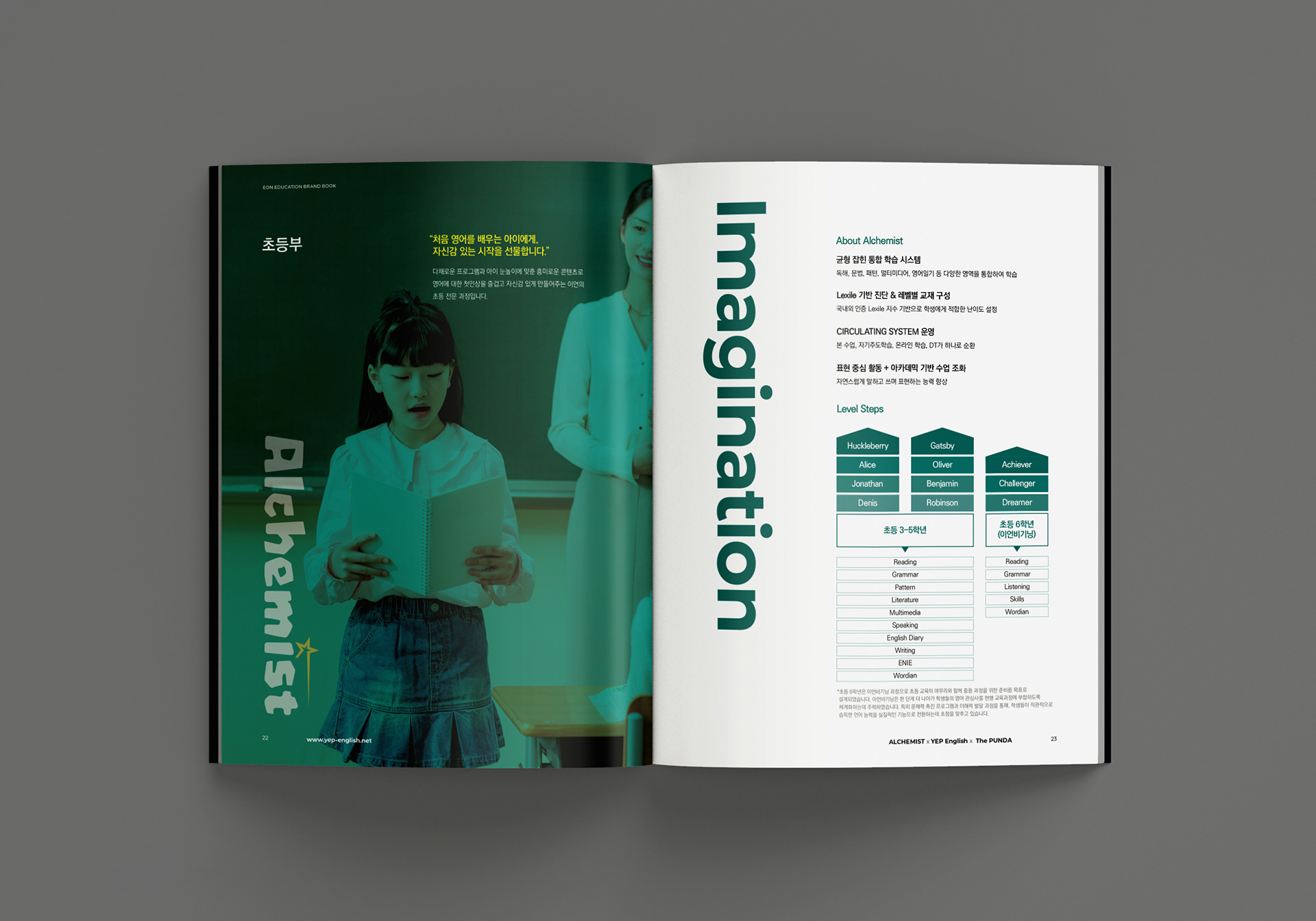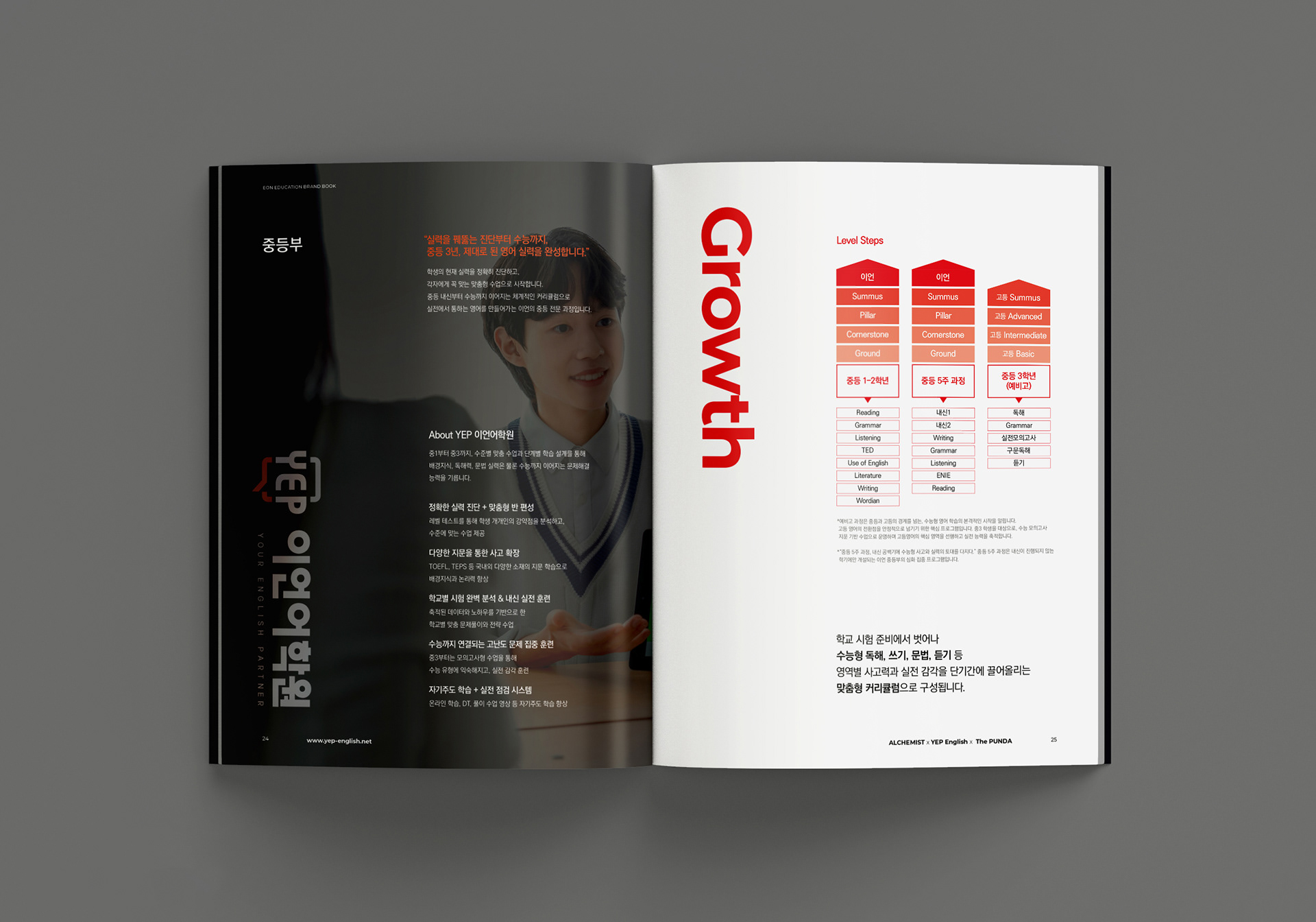 In order to visualize EonEducation's educational philosophy, 'Infinite possibilities that prove with results', the systematic learning flow from elementary to high school is expressed in the layout of 'unbreakable connection and expansion'. While using deep blue tones that give credibility as the main, it is designed so that the unique personality of each brand (Alchemist, YEP, The Punda) is organically harmonized.