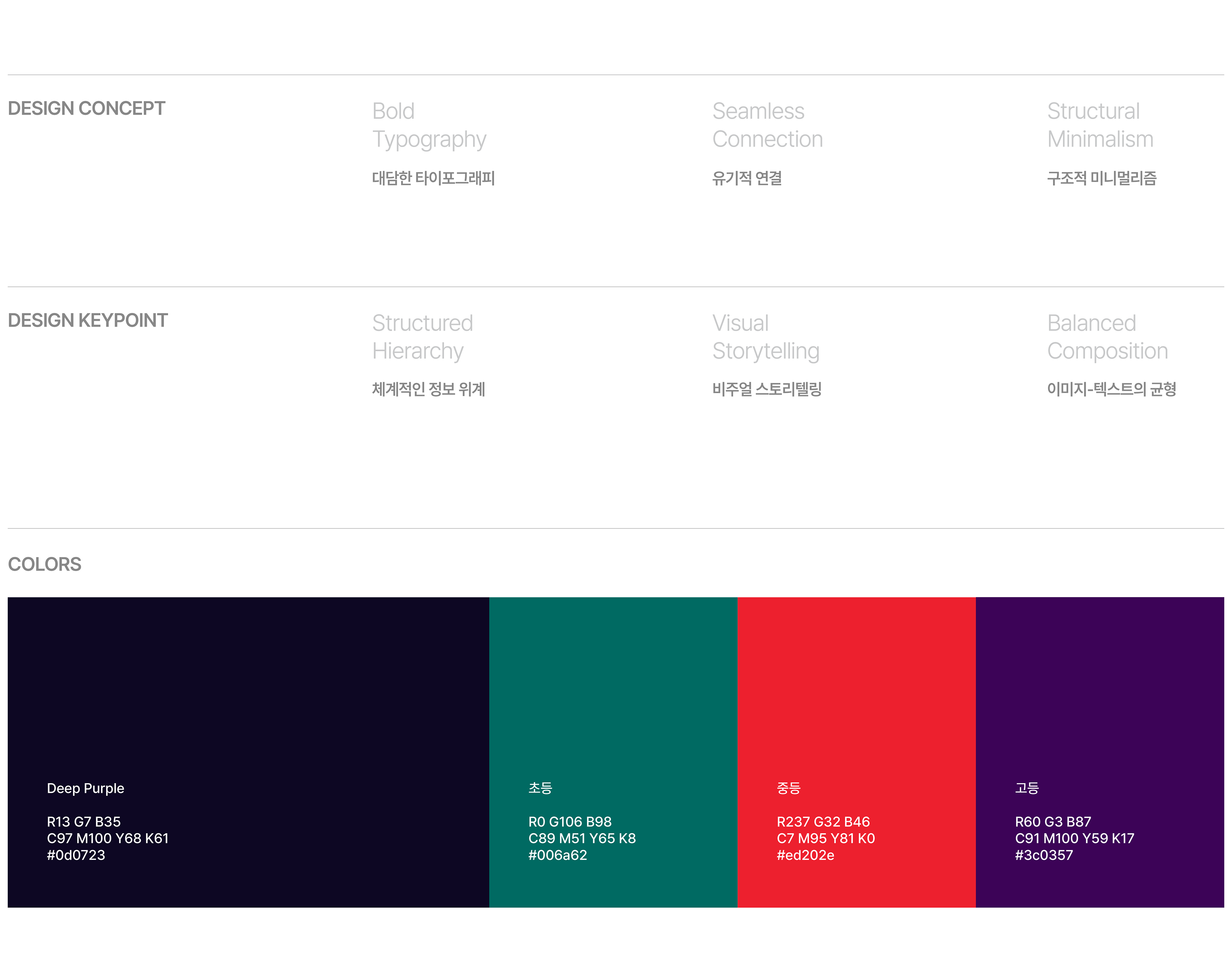 이언에듀케이션의 교육 철학인 ‘결과로 증명하는 무한한 가능성’을 시각화하기 위해, 초등부터 고등까지 이어지는 체계적인 학습 흐름을 '끊기지 않는 연결과 확장'의 레이아웃으로 표현했습니다. 신뢰감을 주는 딥한 보라색을 메인으로 사용하면서도, 각 브랜드(Alchemist, YEP, The Punda)의 고유한 개성이 유기적으로 조화를 이루도록 설계했습니다.