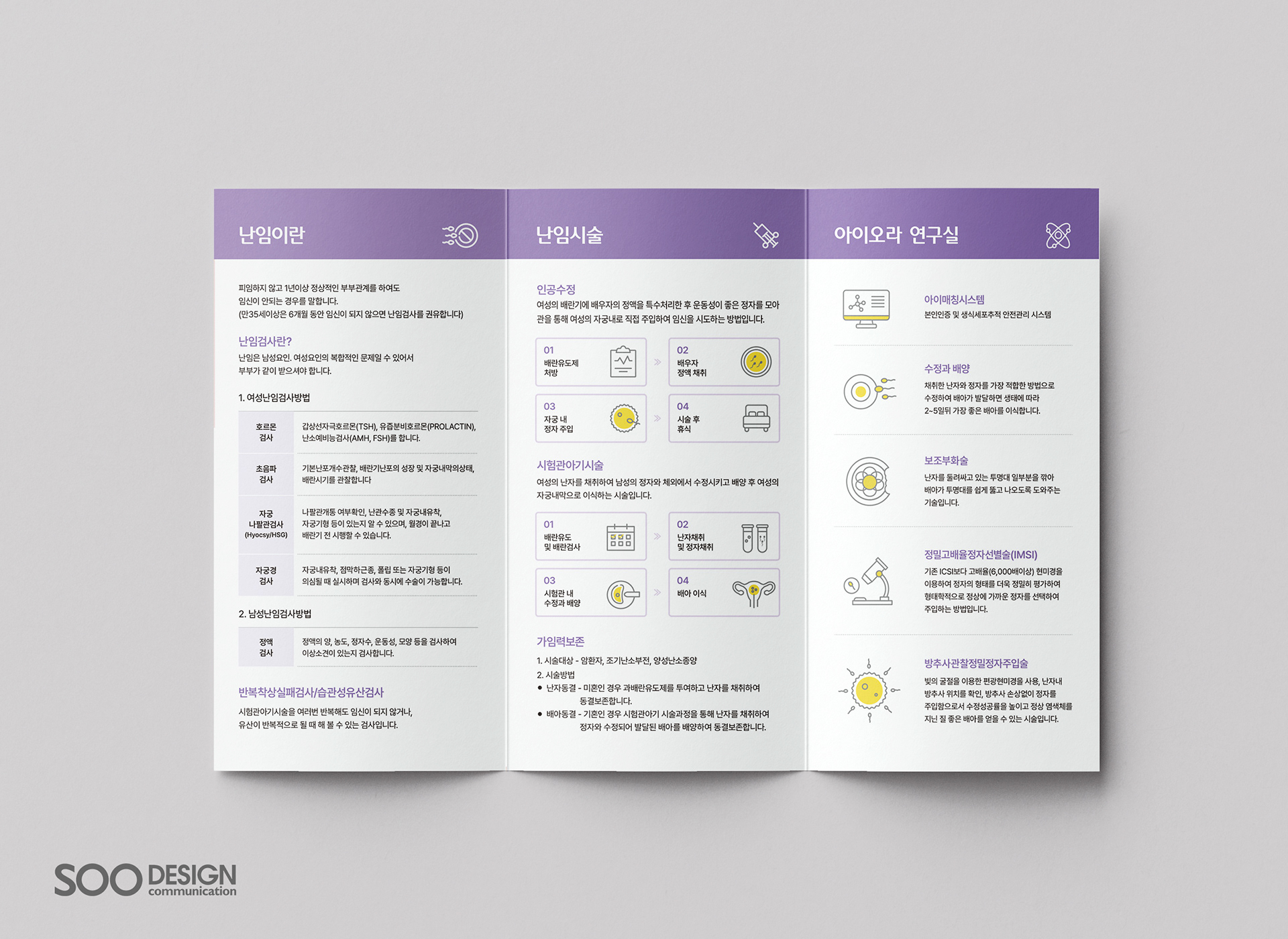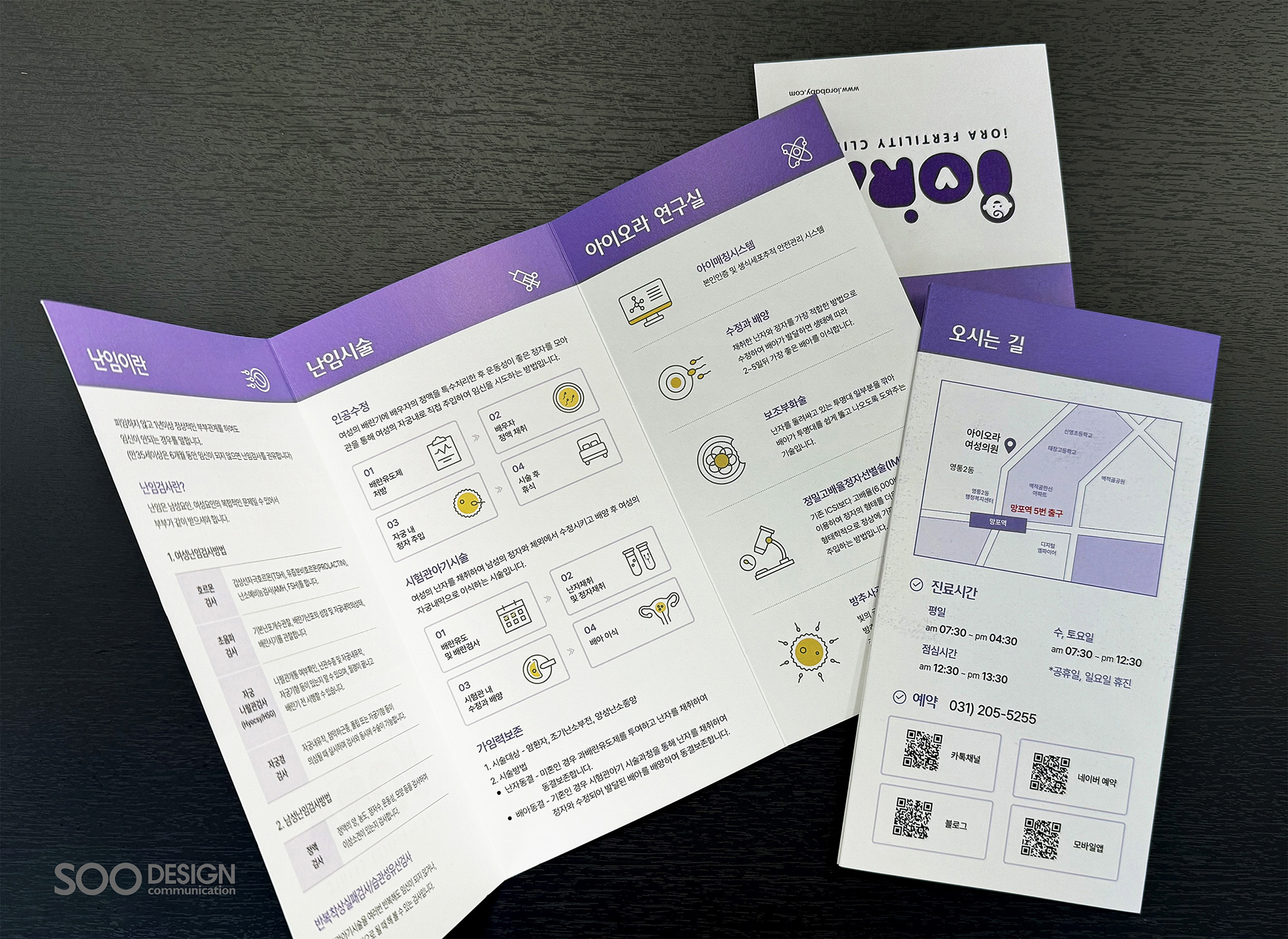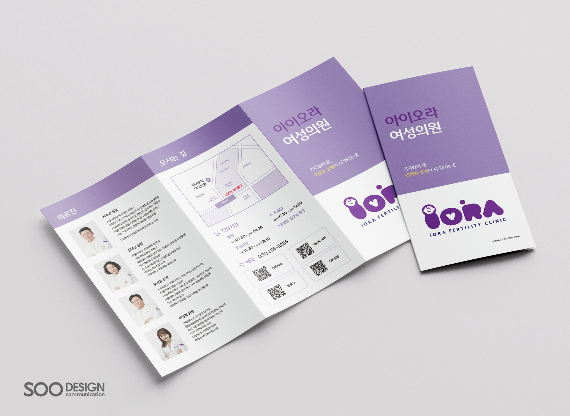 It is the leaflet of the 'Iora Women's Clinic', which specializes in infertility, the beginning of precious life that meets at the end of the wait. It is redesigned with an intuitive layout so that you can grasp vast amounts of information at a glance, from hospital information to major procedures to laboratory introduction.