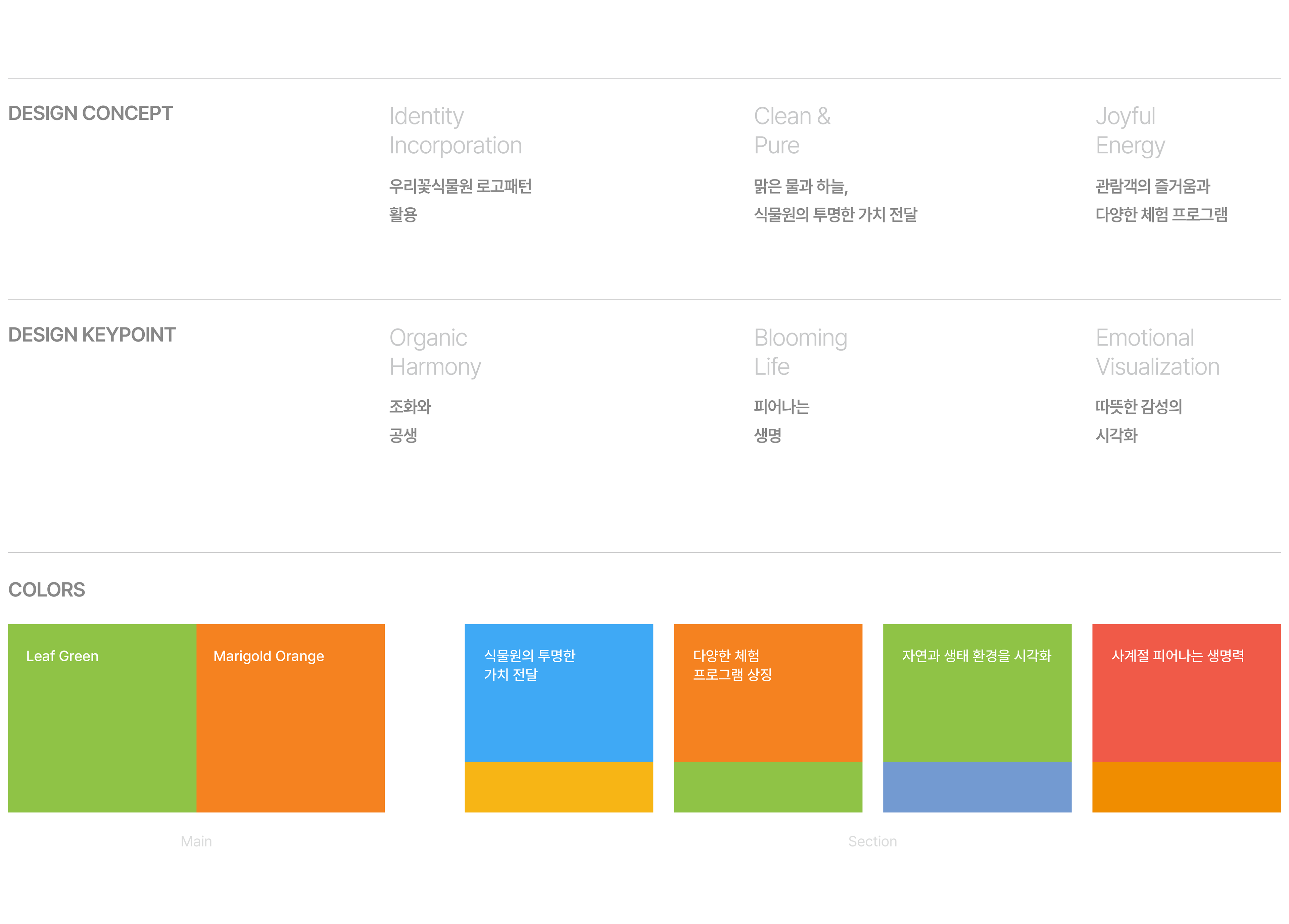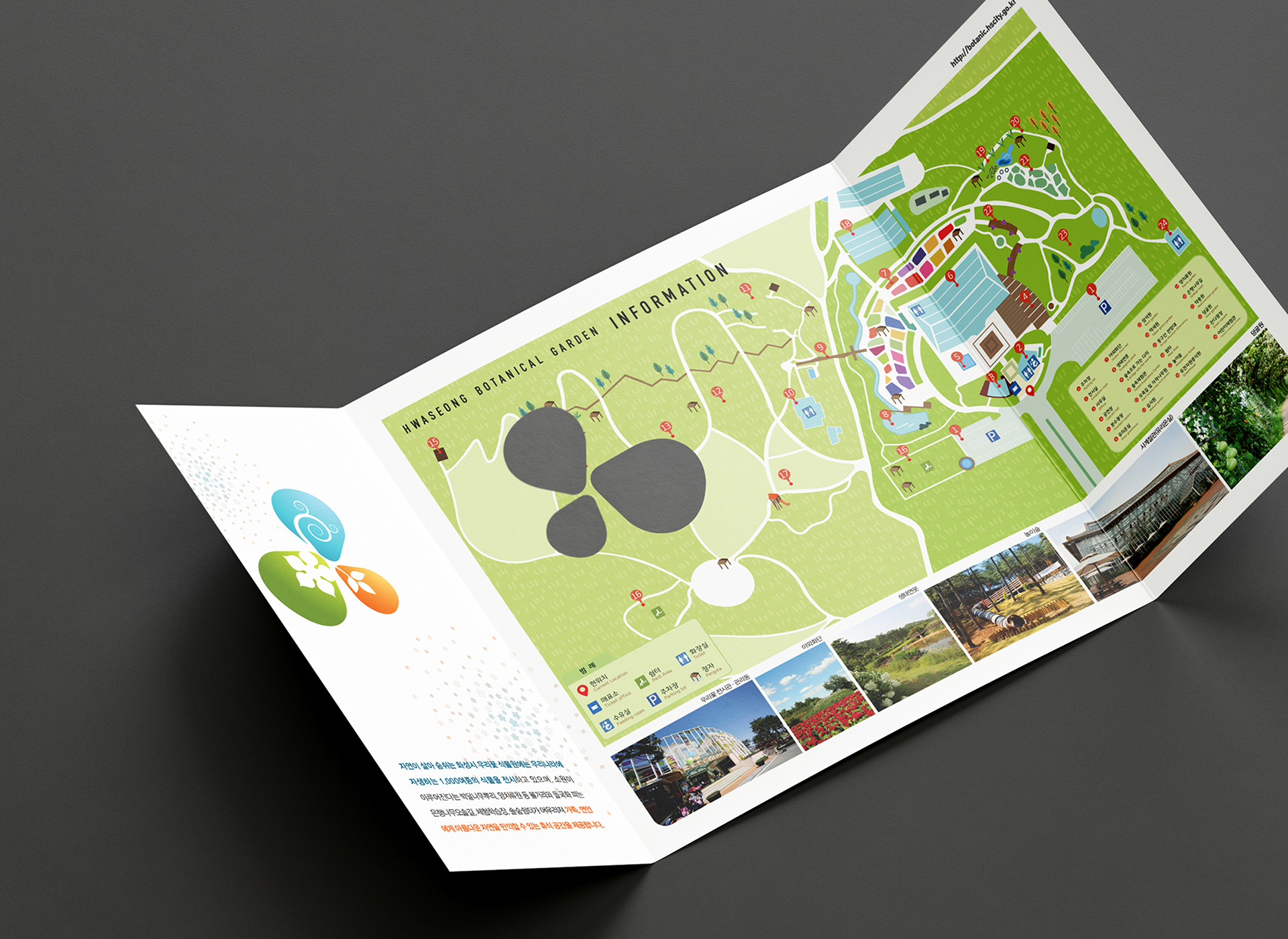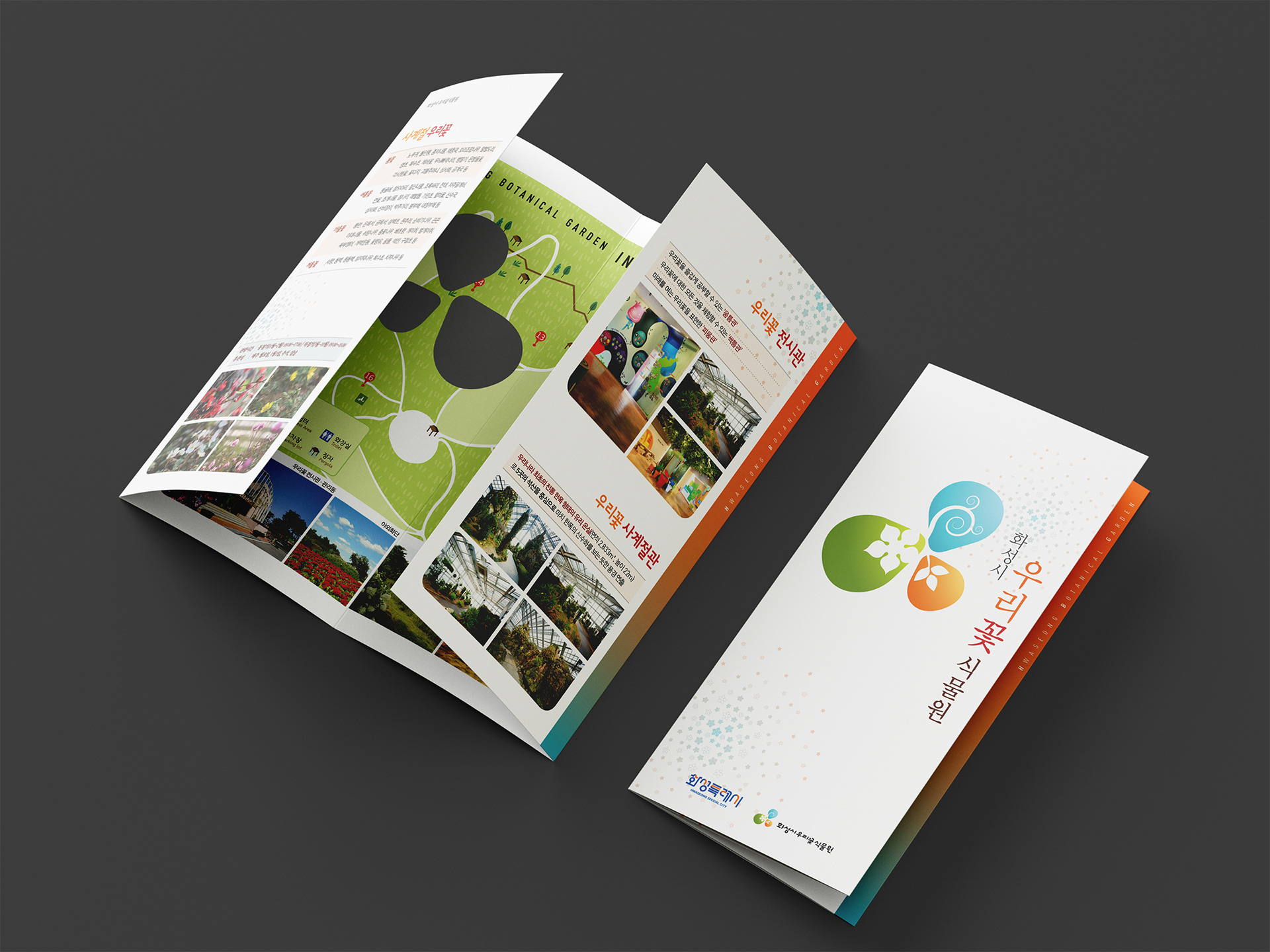 This project focuses on the brochure design for Hwaseong Botanical Garden, aimed at effectively communicating the beauty of native Korean flowers and visitor information. The layout utilizes the brand's identity colors Green, Orange, and Blue to establish a consistent and vibrant visual tone. A warm, illustrative map was developed to enhance readability for family visitors, while organic curved graphic elements reflect the natural landscape and the unique Hanok-style glass greenhouse, delivering a friendly and eco-friendly brand image.