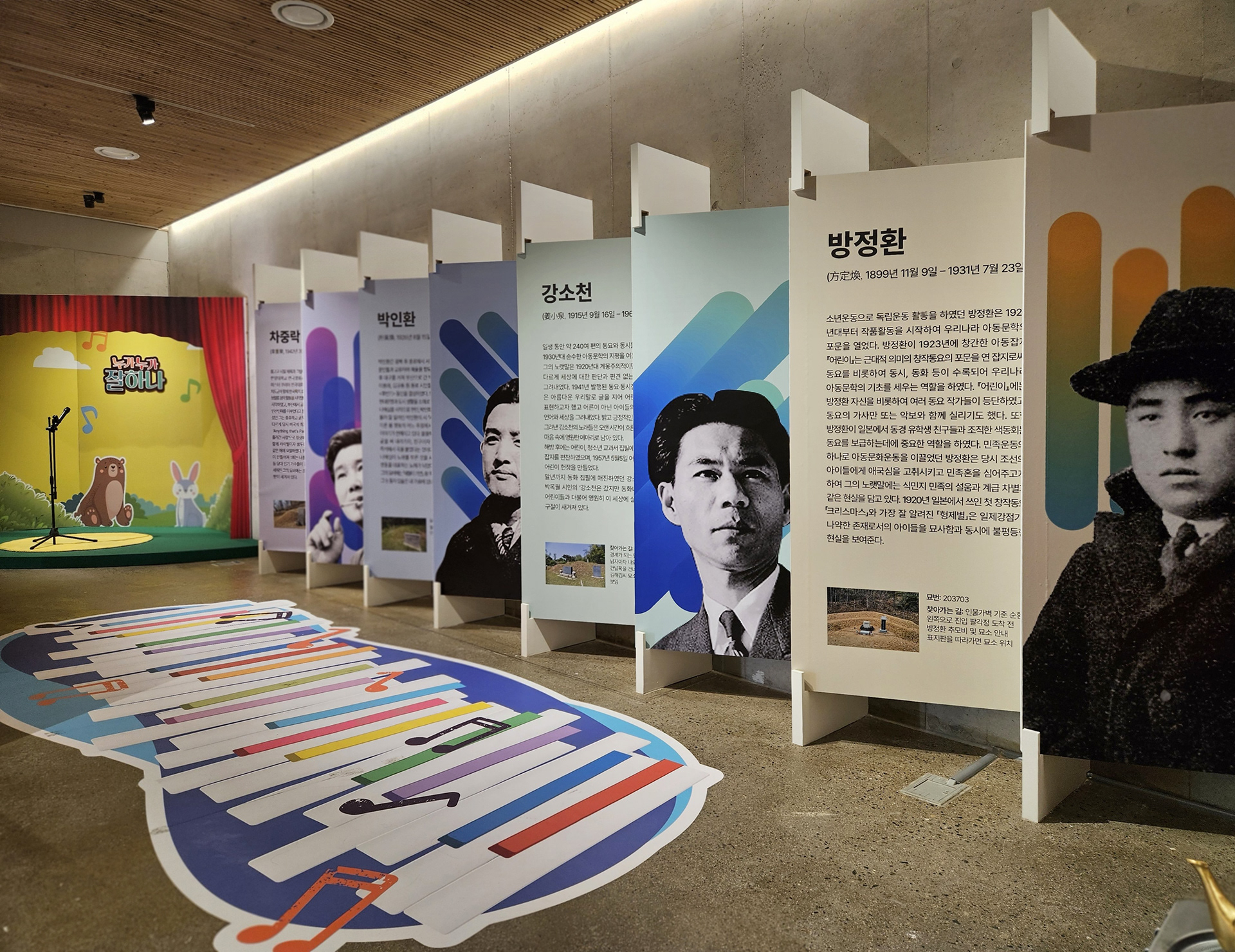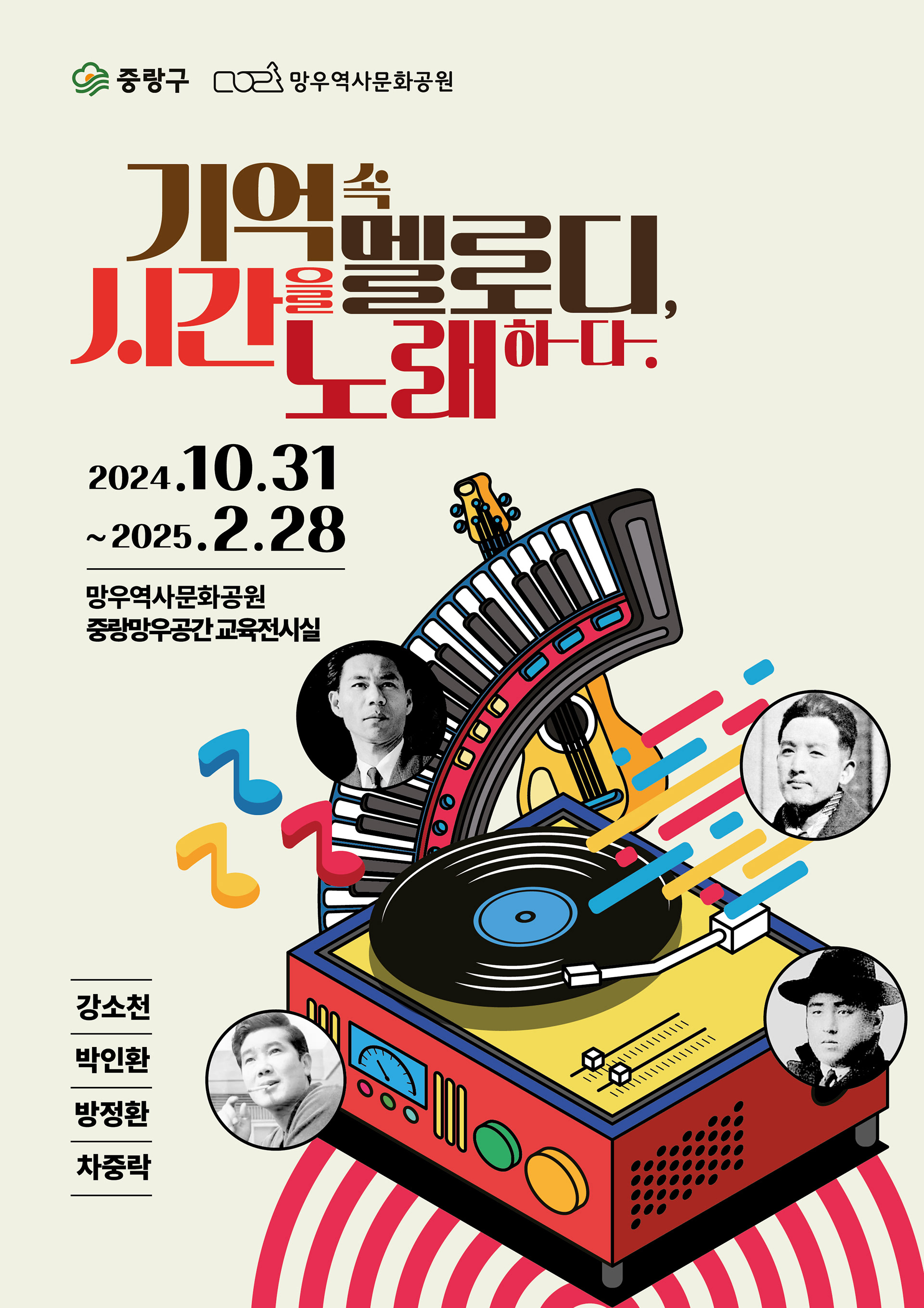 망우역사문화공원 중랑망우공간에서 열린 2024년 하반기 기획전시 "기억 속 멜로디, 시간을 노래하다" 입니다. 음악은 시대를 불문하고 삶과 떼어낼 수 없는 예술입니다. 아름다운 한글 노랫말을 남긴 방정환과 강소천, 박인환의 아름다운 시, 차중락의 중후하고 부드러운 목소리를 느낄 수 있는 전시입니다.