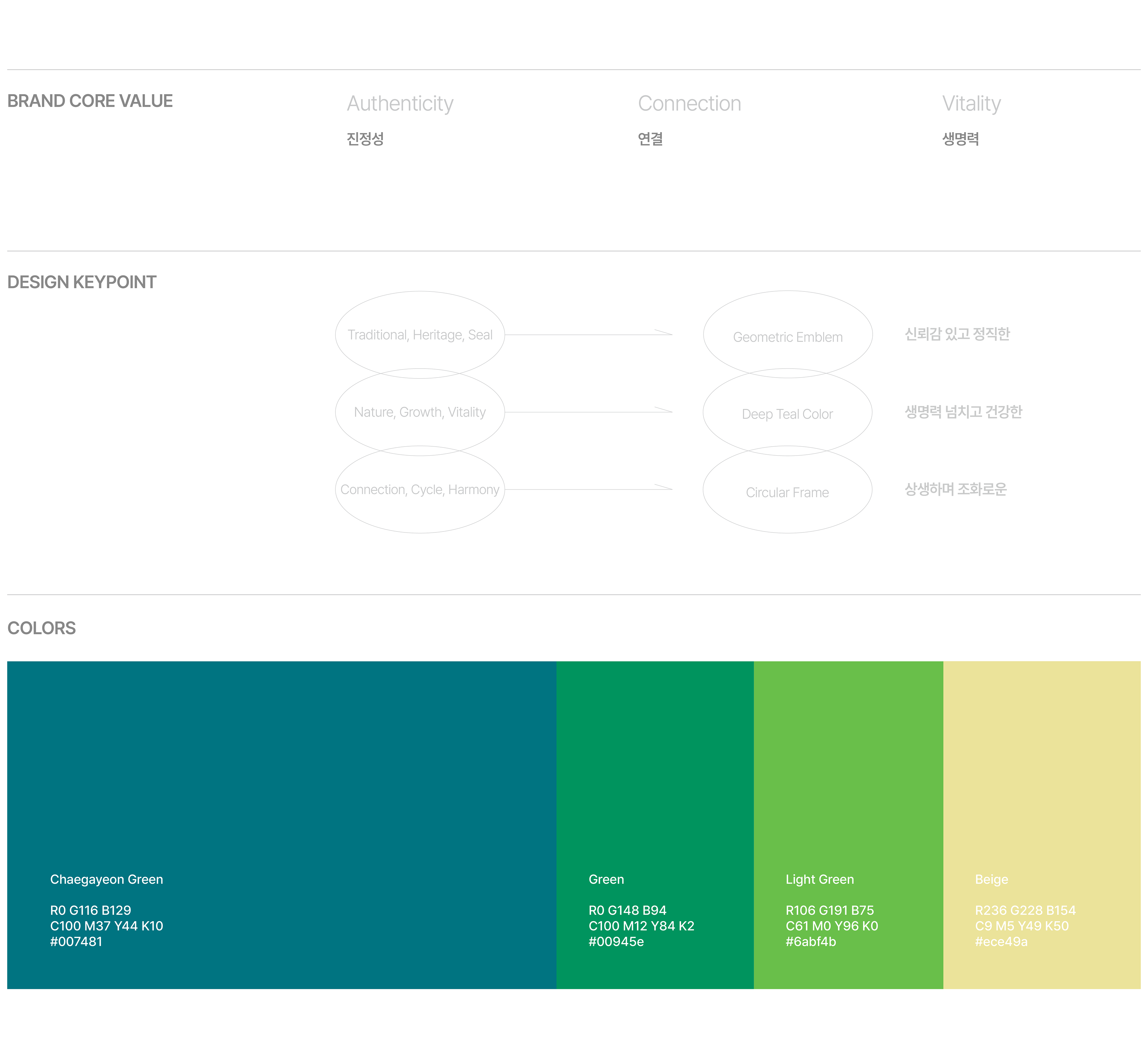 채가연(CHAEGAYEON)은 '채소를 가꾸는 인연' 혹은 '채소가 아름다운 인연'이라는 의미를 담아, 건강한 모종과 농산물을 통해 생산자와 소비자를 잇는 프리미엄 농업 브랜드입니다. 로고의 원형 엠블럼은 완결성과 상생을 상징하며, 전통 문창살 패턴을 연상시키는 기하학적 구조는 한국적 신뢰감과 정직한 품질을 시각화하고 있습니다.